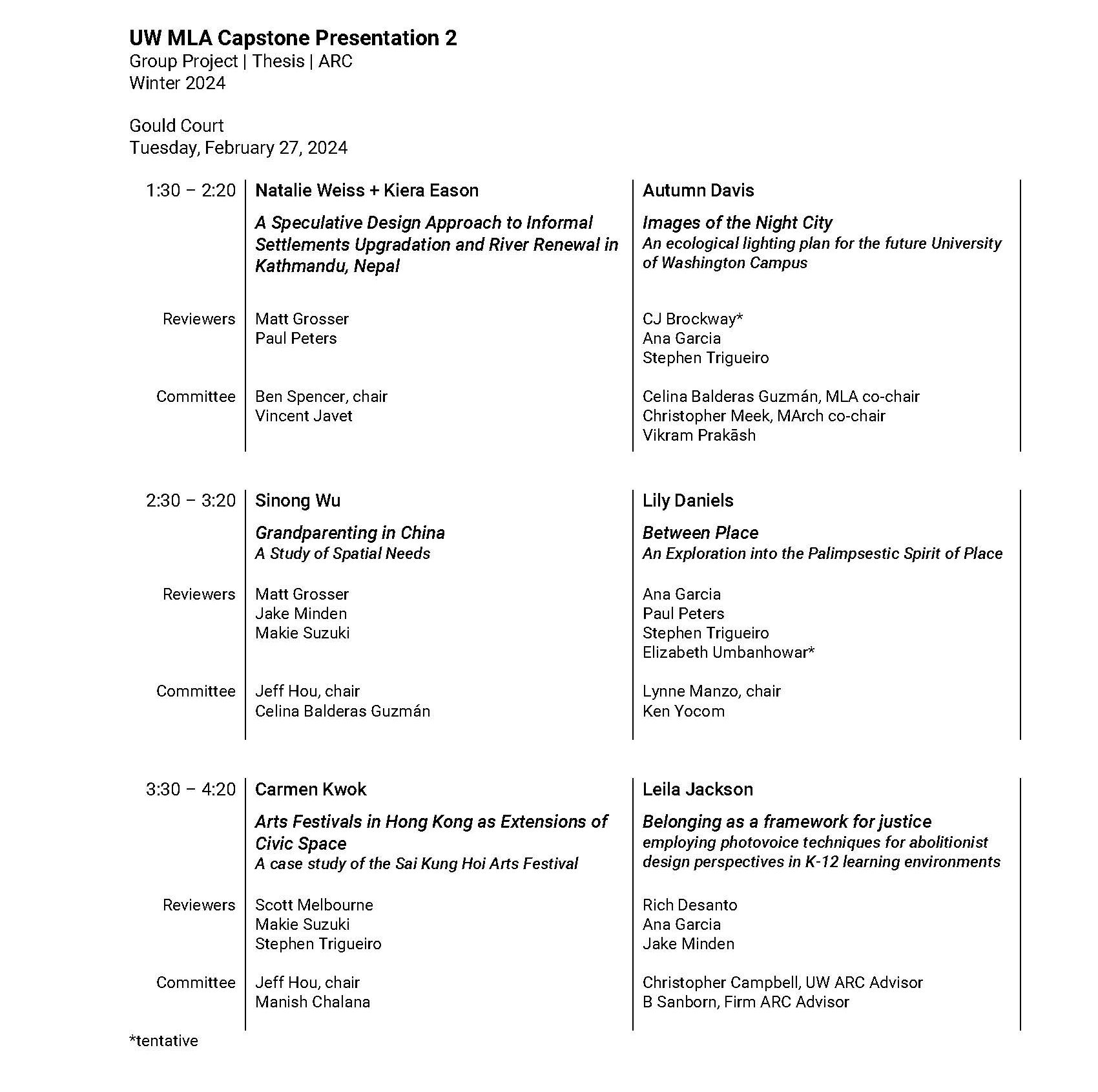 Winter 2024 MLA Capstone Reviews MLA Capstone Reviews are happening this week. Check out some of our student projects! February 27, 2024 Schedule February 29, 2024 Schedule
