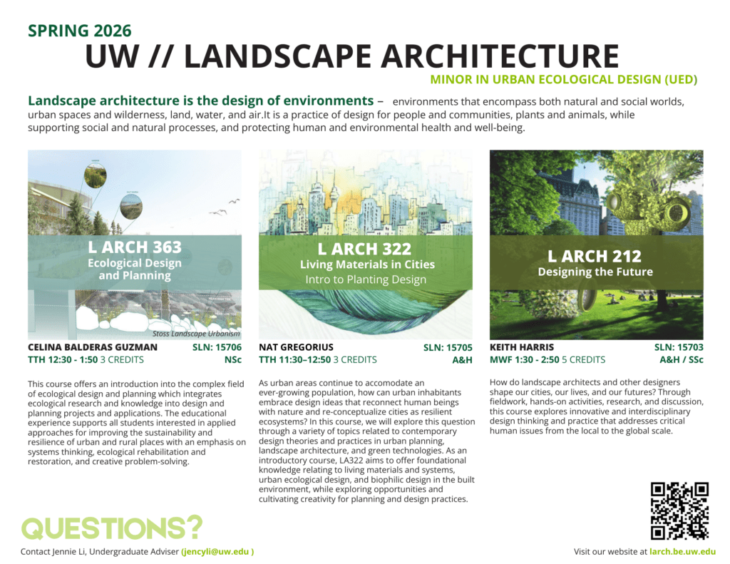 The University of Washington Course Catalog provides a general description for our courses. See below for recent and current course lists. Contact landarchinfo@uw.edu for course syllabi.