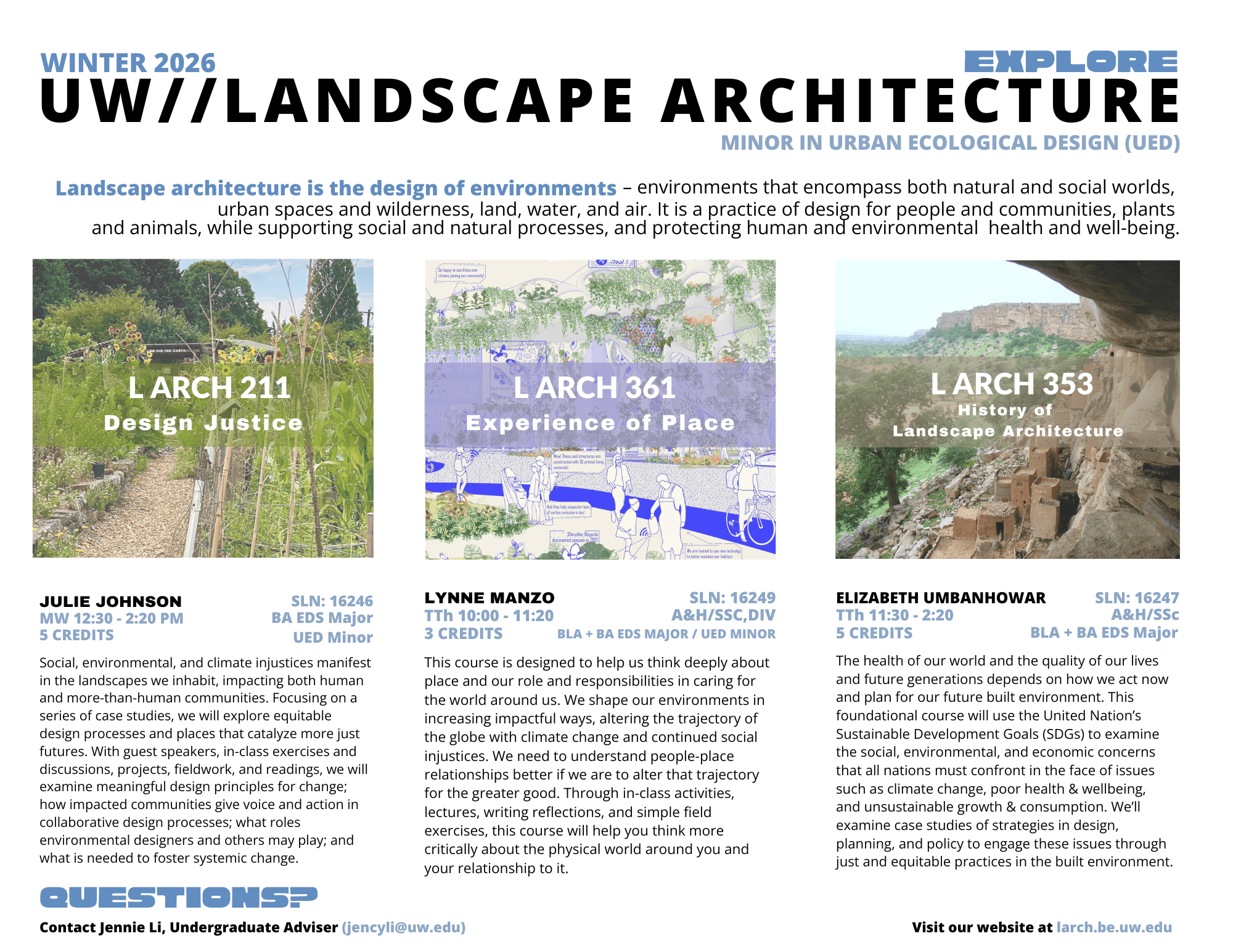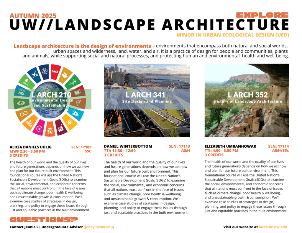 The University of Washington Course Catalog provides a general description for our courses. See below for recent and current course lists. Contact landarchinfo@uw.edu for course syllabi.