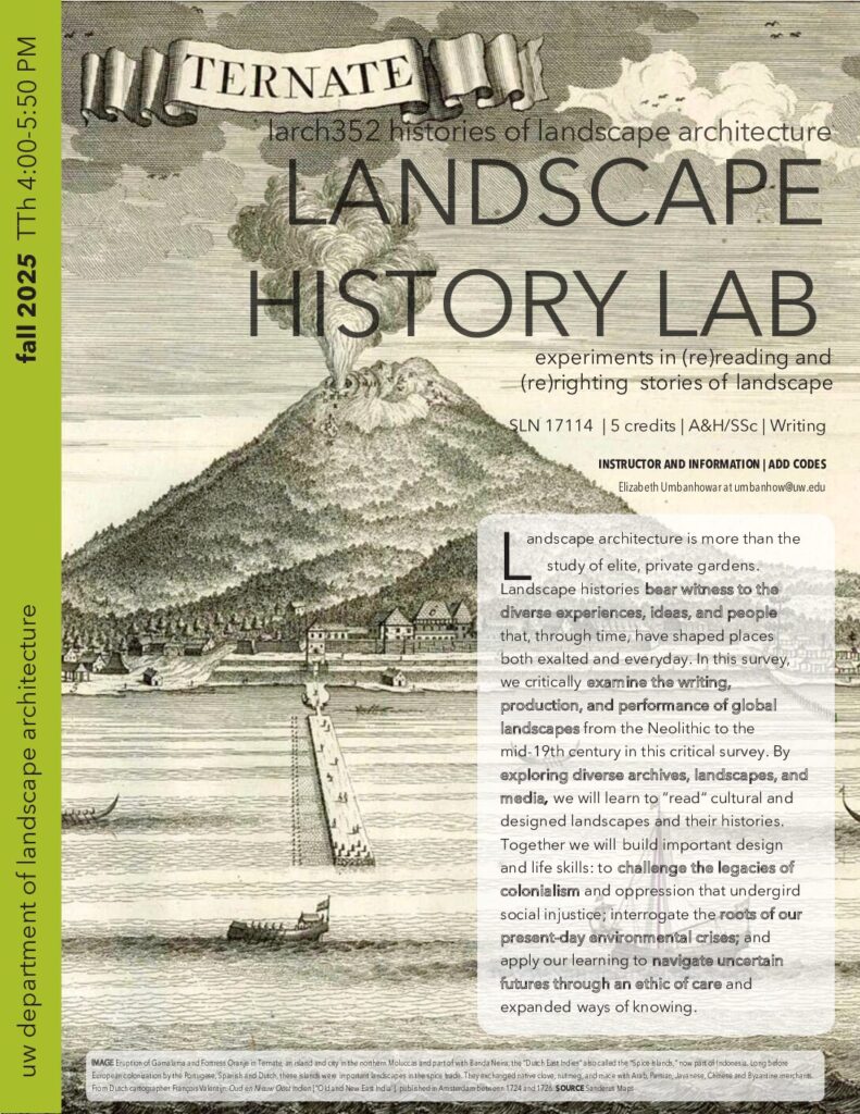 Landscape architecture is more than the study of elite, private gardens. Landscape histories bear witness to the diverse experiences, ideas, and people that, through time, have shaped places both exalted and everyday. In this survey, we critically examine the writing, production, and performance of global landscapes and their narratives from the Paleolithic to the mid-19th century in this critical survey. Through diverse archives, landscapes, and media, we will learn to “read” cultural and designed landscapes and their histories offers important life skills: to challenge the legacies of colonialism and oppression, interrogate our present-day environmental crises, and apply our learning to navigate uncertain futures.