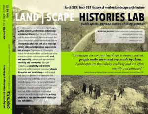 This course explores landscape sites, systems, and symbols from the early 19th century until the present moment, stressing the intersections and entanglements of people and place in history with current politics, experiences, and ecologies. Through creative “lab” exercises, diverse media, and collaborative processes, we will critically examine the writing, production, and performance of landscape and its histories thematically through the diverse lenses of: power and ownership; memory and representation; knowledge and experience; labor and production; materiality and technological innovation; climate disruption and social change; identity and emotion; and race, class, and gender.